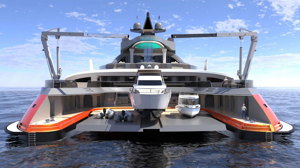 The yacht is designed to feature three swimming pools on separate decks, one above the other, with cascading waterfalls between them, reminiscent of ancient Roman baths. The crew will consist of thirty people—twelve sailors and a captain, along with additional staff to serve 44 guests in 22 double suites. The yacht’s power will be provided by a network of solar panels on the top deck, which also serves as a helicopter landing pad. And if you’re wondering about the yacht’s name, Prodigium is Latin for “wonder.”