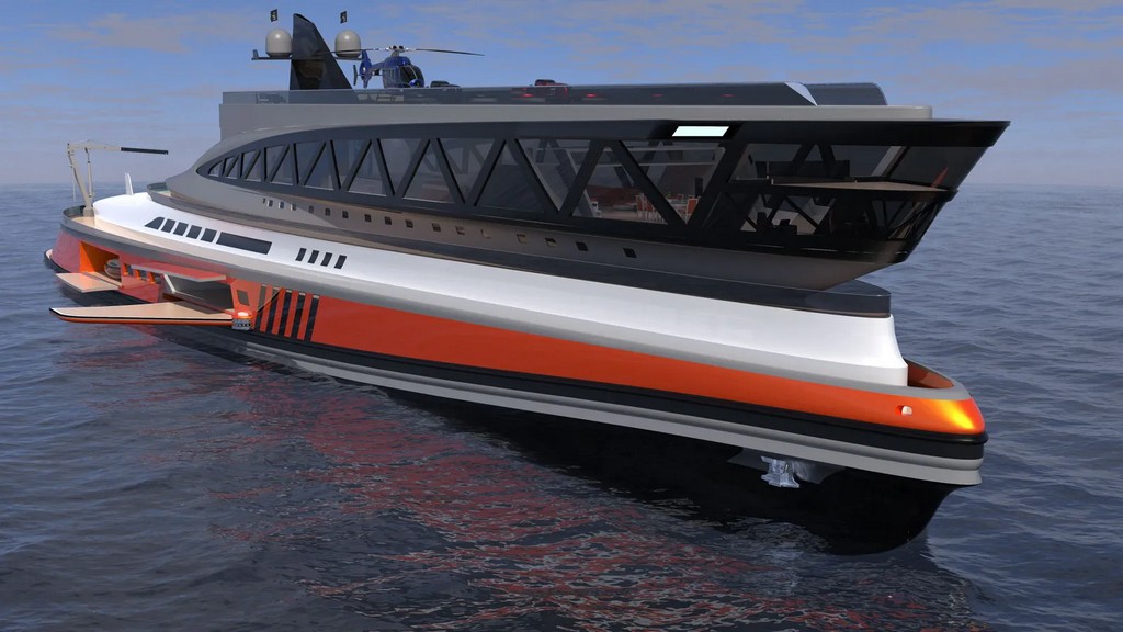 The Prodigium, measuring 153 meters in length, features a metal bay at its stern for two vessels up to thirty meters long, which will be stored on a floating deck. The yacht’s interior can accommodate three helicopters in separate hangars. It is constructed with six decks and resembles a shark in its external form. The upper part, shaped like a shark’s nose, is made of aluminum and carbon fiber, supported by two Roman columns.