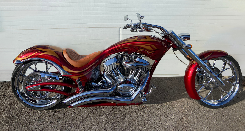 Big Dog is a small manufacturer from Kansas that produces custom motorcycles. The bike before us is number 96 out of 156 units made in 2009. Customization includes a choice of 69 body colors. This particular bike features an unusually large 23-inch front wheel and is equipped with an S&S V-Twin engine with a beefy 1.9-liter displacement. Big Dog motorcycles are known for their exceptional build quality and paintwork, and this one showcases a combination of Candy Apple Red and polished gold. The bodywork is designed with flowing lines, and the seating position resembles that of a classic chopper, but it is very low, unlike the upright, rearward-leaning posture typical of choppers. Price: $36,300.