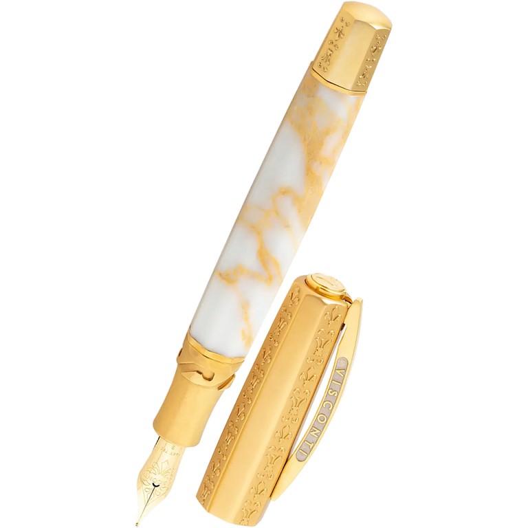 The Italian luxury brand Visconti is launching the seventh edition of its *Il Magnifico* pen series, dedicated to Lorenzo de’ Medici (“Lorenzo the Magnificent”). De’ Medici, a leader of Florence, was also renowned as a patron of Renaissance culture and an important supporter of prominent artists of the time. The pen’s unique appearance is achieved through a combination of elegant and rare white Italian Carrara marble, the same used in projects by artists like Michelangelo and Donatello, yellow gold veins mined from the Apennine Mountains, and brass. The pen’s cap is adorned with decorative elements that reflect Florentine tradition, made of metal and coated in gold, with the same material used for the clip. The price of the pen: approximately 2,400 euros.